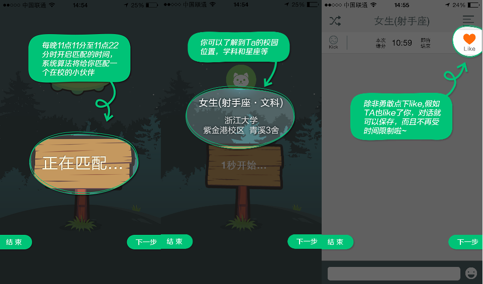 “11 點 11 分”的玩法,是在每天晚上 11 點 11 分之后,允許你以匿名身份隨機匹配一個同校、同城或者全國范圍內的在校大學生異性。你的每次配對,都有 11 分 11 秒的聊天時限,時限終止后你們之間的關系鏈、聊天記錄都將被徹底刪除,有點“快速相親”的感覺。